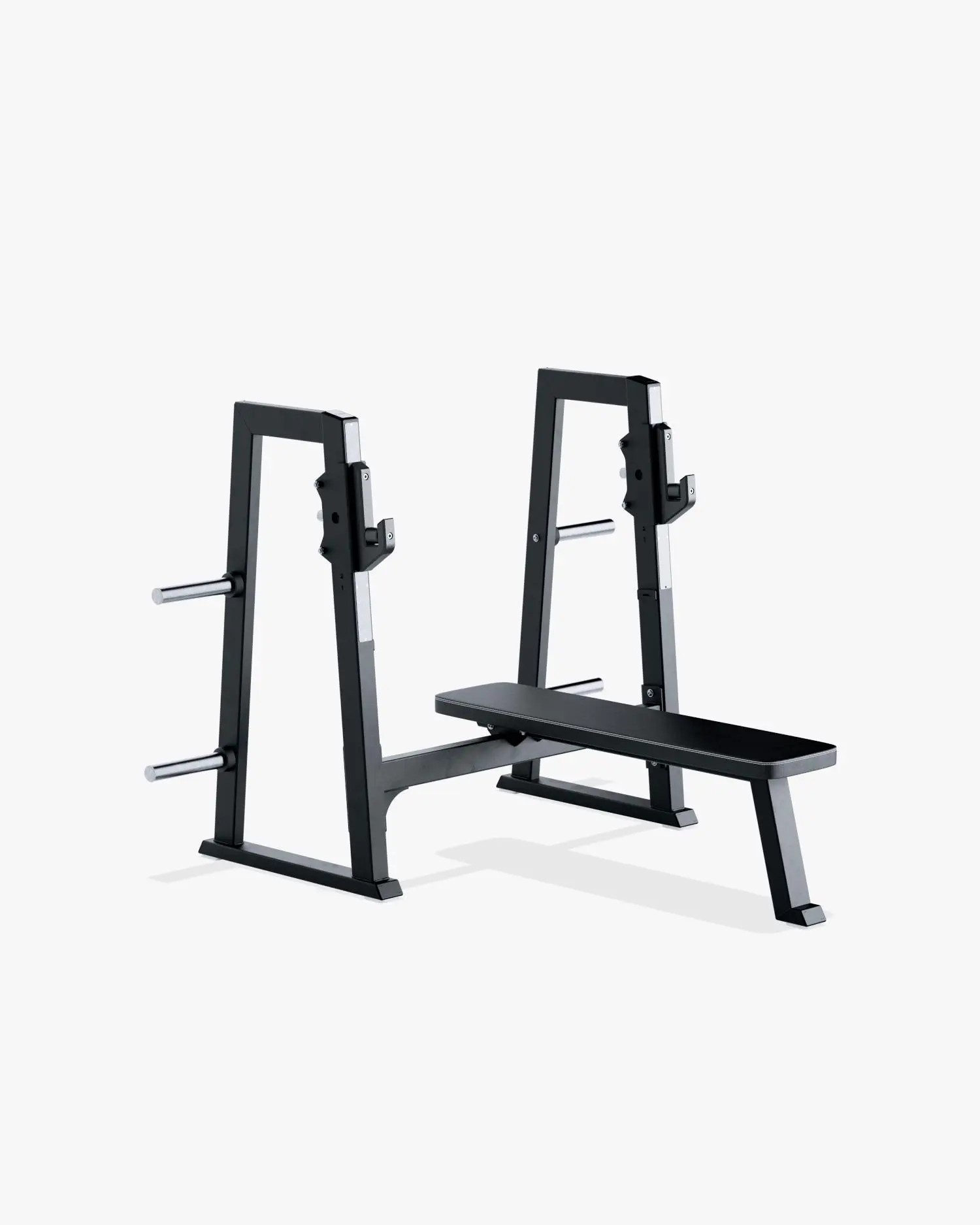 The Eleiko Olympic Flat Bench combines user friendly features with smart details to ensure safety and minimize maintenance. It is designed to perform a variety of bench press exercises from a flat bench position. The bench features ten height adjustments for the bar hooks so users can find a comfortable starting and ending position. Adjustment positions are numbered on both side of the uprights so lifters can easily confirm their position. The hooks feature built-in polyurethane rollers to protect the bar knurling and allow lifters to adjust the bar while loaded for optimal positioning. The integrated weight storage pins keep weights close at hand and the lifting area clutter free. If extra stability is needed, the bench can be bolted to the ground using the hidden bolt holes in the frame.
